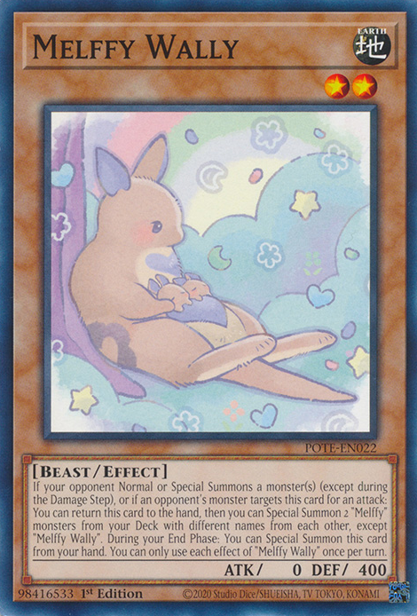 If your opponent Normal or Special Summons a monster(s) (except during the Damage Step), or if an opponent's monster targets this card for an attack: You can return this card to the hand, then you can Special Summon 2 "Melffy" monsters from your Deck with different names from each other, except "Melffy Wally". During your End Phase: You can Special Summon this card from your hand. You can only use each effect of "Melffy Wally" once per turn.