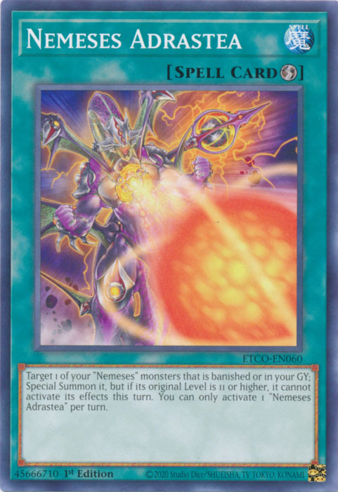 Target 1 of your "Nemeses" monsters that is banished or in your GY; Special Summon it, but if its original Level is 11 or higher, it cannot activate its effects this turn. You can only activate 1 "Nemeses Adrastea" per turn.