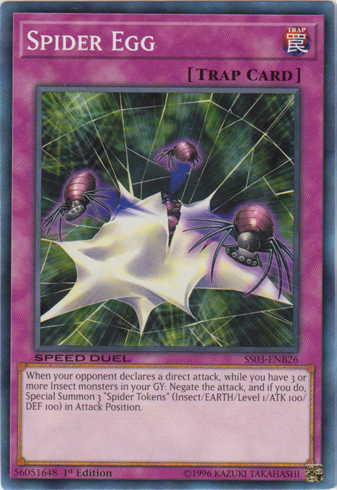 When your opponent declares a direct attack, while you have 3 or more Insect monsters in your GY. Negate that attack, and if you do, Special Summon 3 "Spider Tokens" (Insect-Type/EARTH/Level 1/ATK 100/DEF 100) in Attack Position.