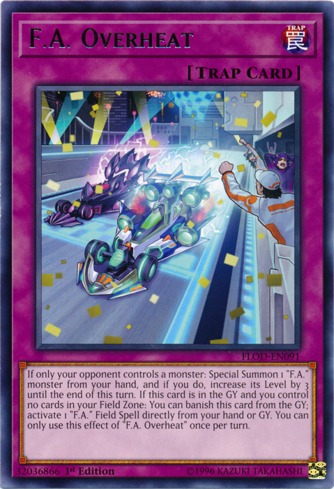 If only your opponent controls a monster: Special Summon 1 "F.A." monster from your hand, and if you do, increase it’s Level by 3 until the end of this turn. If this card is in the GY and you control no cards in your Field Zone: You can banish this card from the GY; activate 1 "F.A." Field Spell directly from your hand or GY. You can only use this effect of “F.A. Overheat” once per turn.