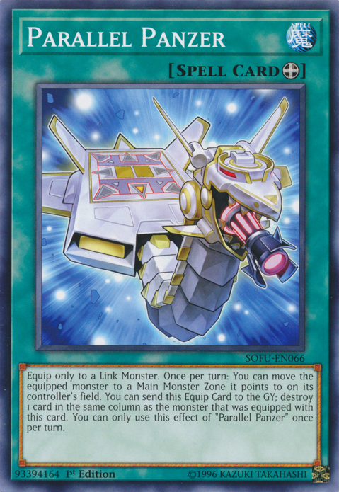 Equip only to a Link Monster. Once per turn: You can move the equipped monster to a Mans Monster Zone it points to on its controller's field. You can send this Equip Card to the GY; Destroy 1 card in the same column as tha monster that was equipped with this card. You can only use this effect of "Parallel Panzer" once per turn.