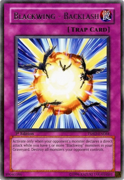 Activate only when your opponent's monster declares a direct attack while you have 5 or more "Blackwing" monsters in your Graveyard. Destroy all monsters your opponent controls.